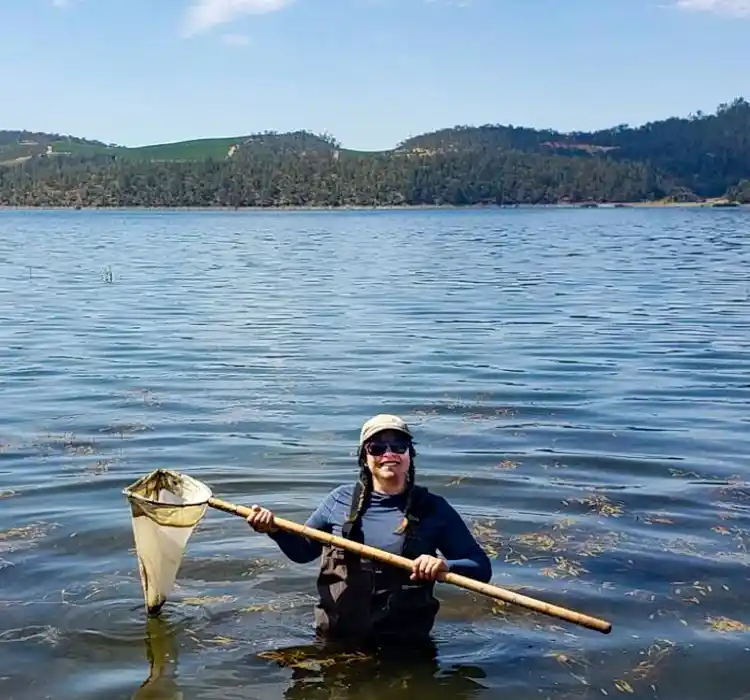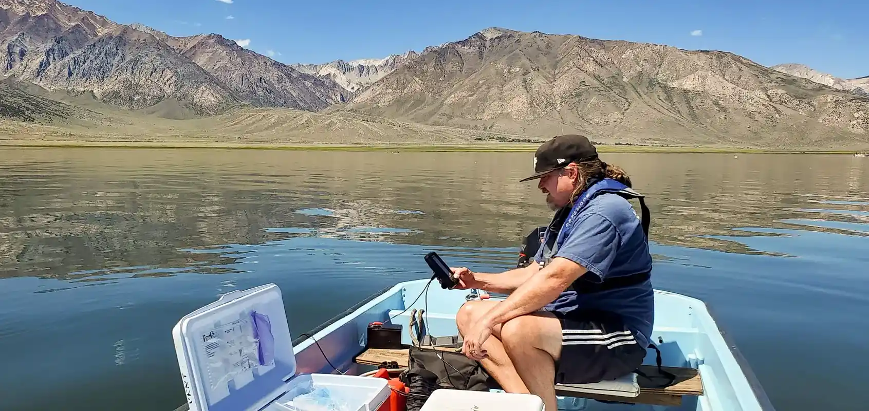 EPA Region 9 crew member measuring water quality with a sensor at one of the National Eutrophication Survey lakes, California. Lareina Guenzel, EPA.