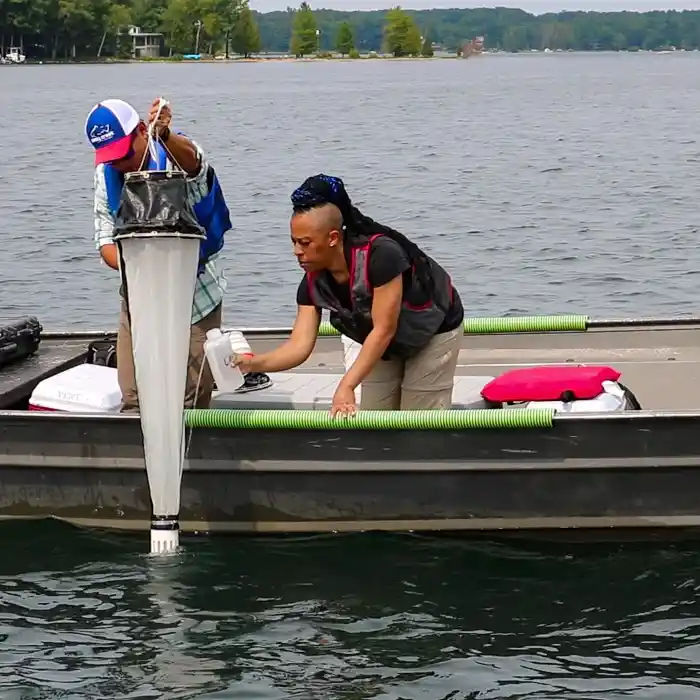 EPA staff demonstrating collection of a zooplankton sample. To learn more about zooplankton sample collection, view the NLA zooplankton collection training video. Great Lakes Environmental Center.